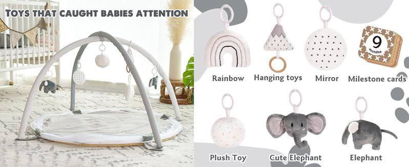 - 6 Hanging Toys & Milestone Cards: This baby gym package is a treasure trove of delights. It includes a set of 6 toys that stimulate your baby's senses and encourage exploration. The package also features an adorable elephant zipper bag, designed to hold pacifiers, creams, and more. Additionally, you'll get 12 colorful milestone cards to commemorate each month of your baby's first year.