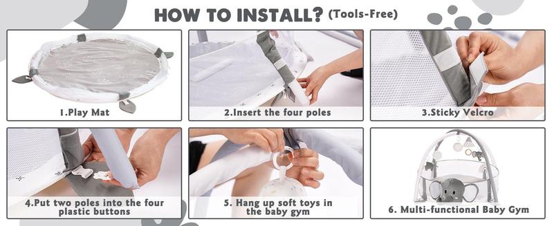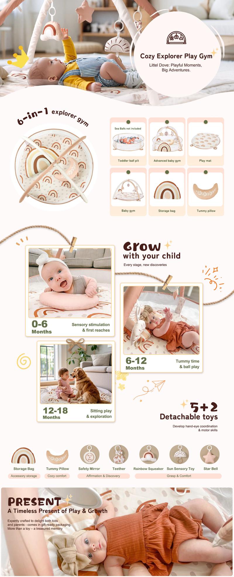 - 6 IN 1 ADAPTABLE BABY GYM: Experience the ultimate in versatility with our dynamic baby play gym. It effortlessly transforms into a play mat, tummy time area, baby gym, protective fence, and ball pit (Balls not included). Watch your little one explore, learn, and have endless fun at every stage.