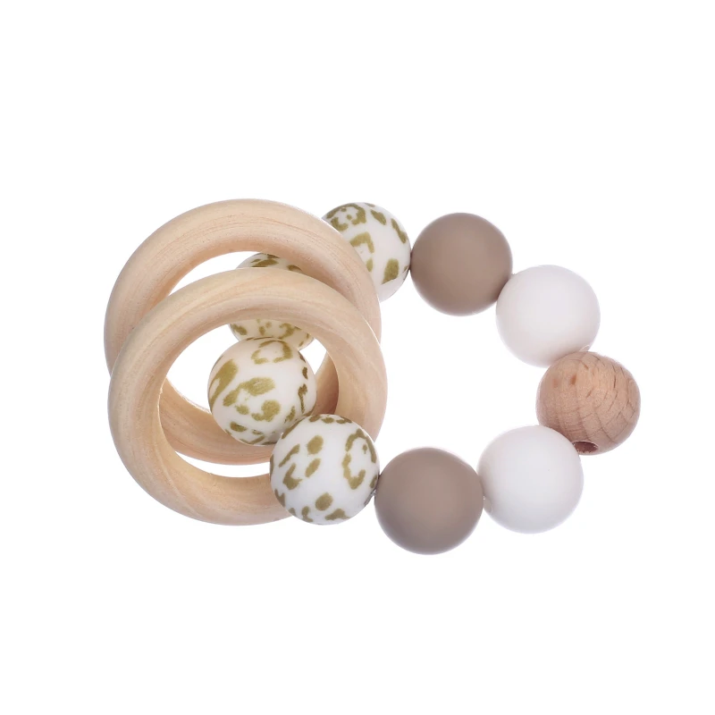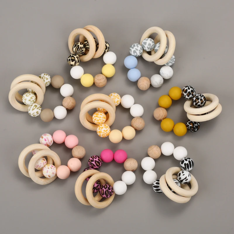 Baby Beech Wood Teething Double Rings Leopard Print Silicone round Beads Bracelet for Nursing Baby Teether Rattle Toys BPA Free