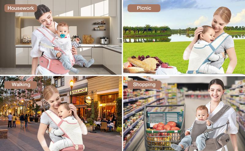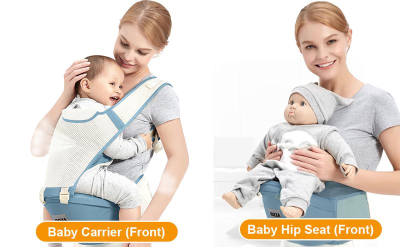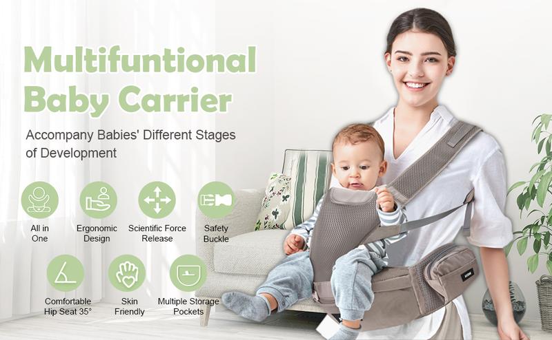 Baby carrier with hip seat, adjustable and removable. this baby carrier is designed with three combinations and six carrying ways.It complies with the rules of baby's spinal development and can be used in different ways according to the child's growth. It is suitable for 0-36 months old.