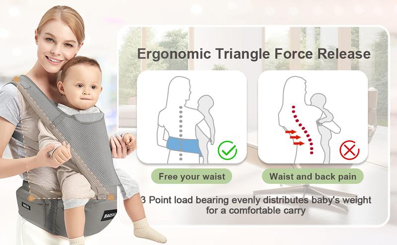 Ergonomic design,distributes the force points evenly on the abdomen, waist, and shoulders of the adult, and the three parts are with standing evenly the power to prevent spinal injury caused by unreasonable load bearing for along time.